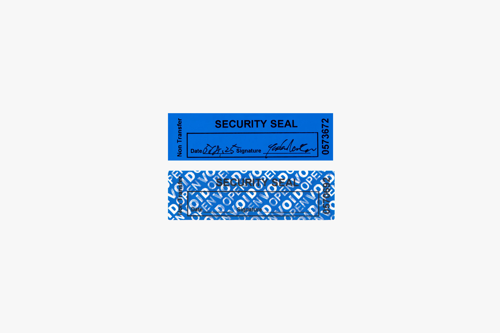 本作で使用されたラベルは、実際に使用されている二重構造のもので、表面を剥がすと「VOID(無効)」という文字が残り、ラベルとしての役割を終える。中谷はこの機能そのものに着目し、「剥がれ」や「無効化」を絵画表現へと転用した。そこには、表層的な保証や価値が失われたあとにこそ、むしろ人間らしい美しさが現れるのではないかという視点がある